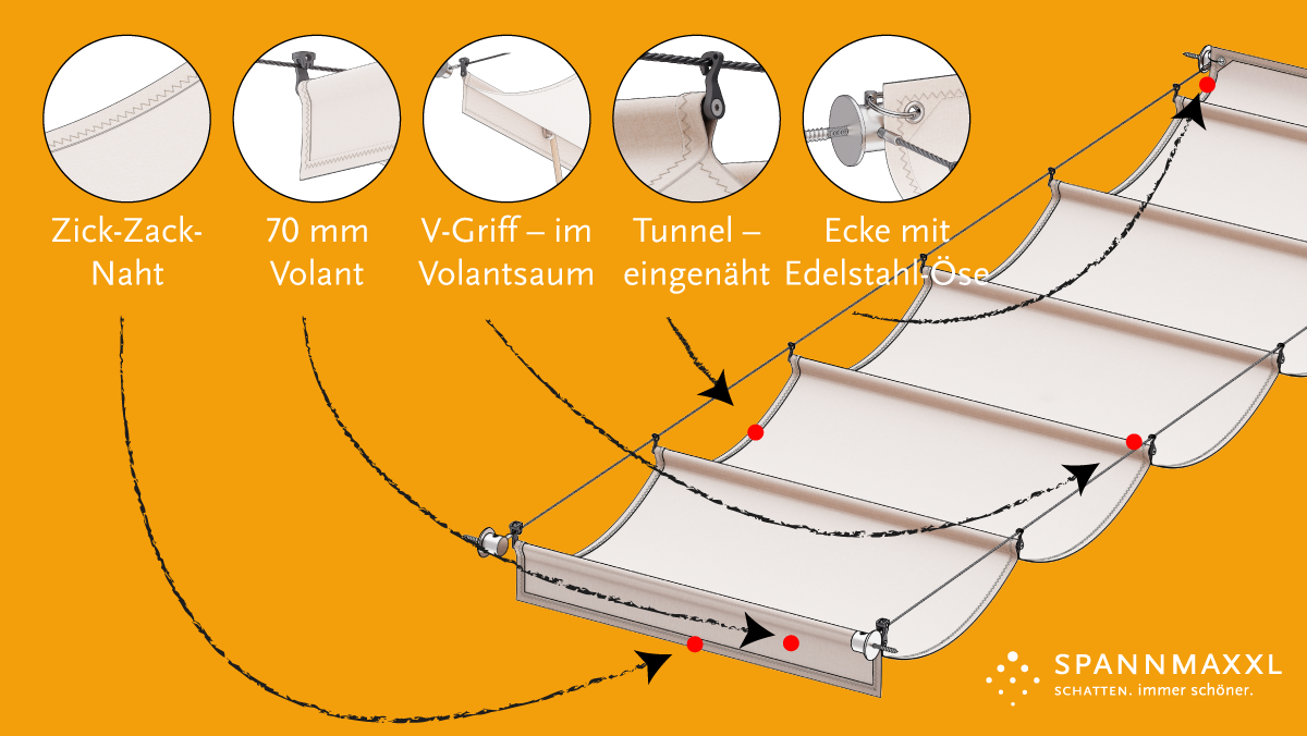 Erfahren Sie alles über unsere Rabatt-Aktionen. So finden Sie den richtigen Moment, um Ihre Beschattung zu bestellen. In der Zwischenzeit lernen Sie, welche Details und Unterschiede die SPANNMAXXL-Wolkenbahn zu Ihrer besten Lösung machen.