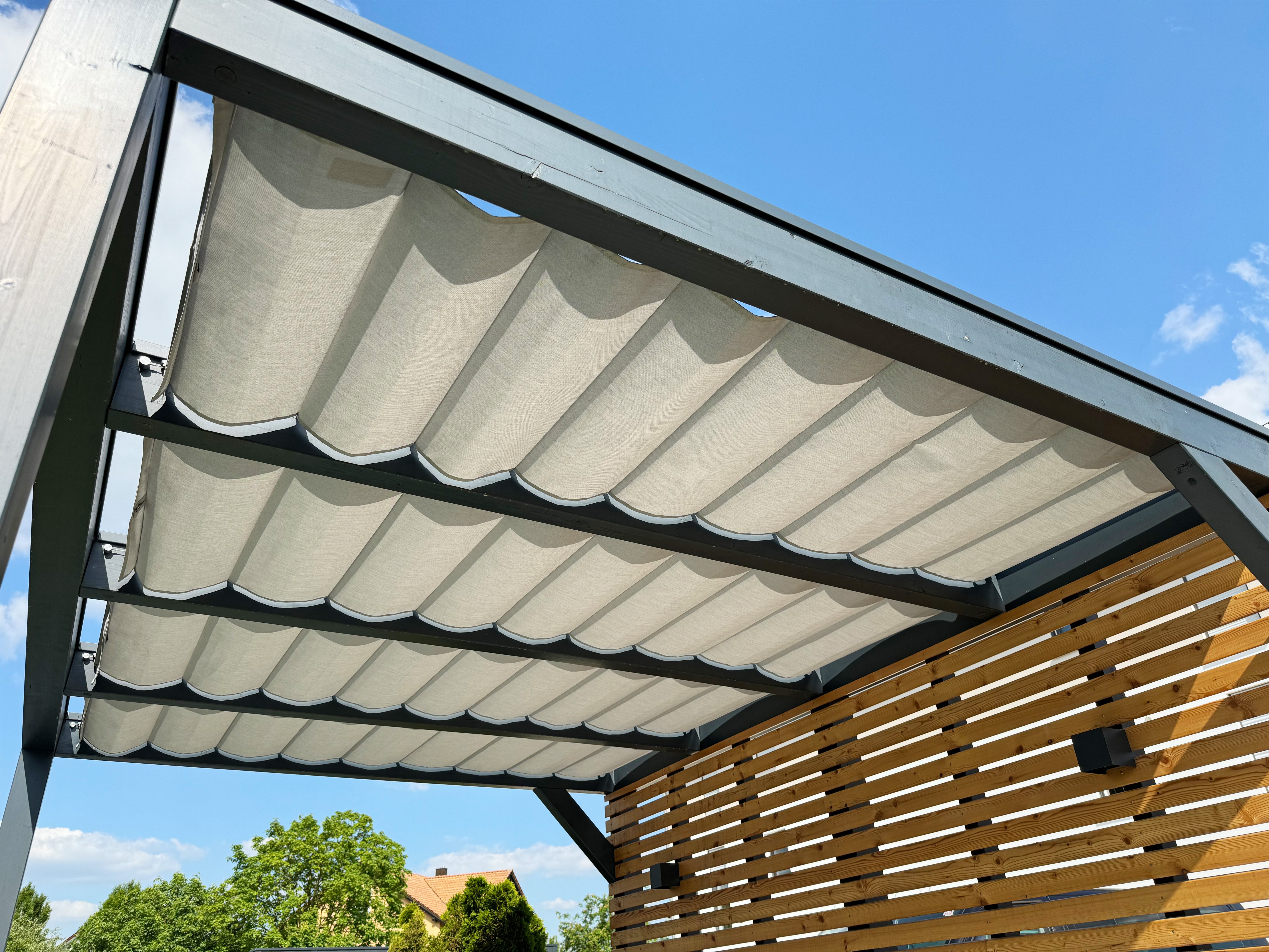 Bei Wintergärten und Terrassendächern also kein Problem. Bei Pergola-Dächern ist dafür zu sorgen, dass die Seilspannmarkise in der Pergola eine keine „Garage“ bekommt: ein Ort, an dem sie vor Wind und Wetter geschützt ist. Zum Beispiel ein kleines Dach, unter das die Seilspannmarkise geschoben wird.