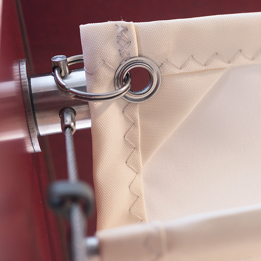 Eingeschoben in die Wolkenbahn, übertragen die Alurohre das Gewicht der Markise senkrecht an die Seile. So erfolgt das <Verschieben leichtgängig>. Weil die Pendelhaken seitlich offen sind, lassen sie sich einfach ein- und aushängen – wichtig für die Montage, aber auch die <Reinigung und Pflege>.