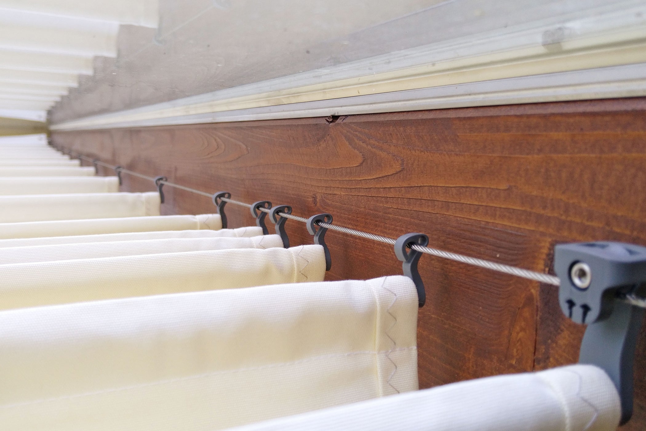Alternative 1 ? – Bei anderen Lösungen kommen teils Clips, Klammern, oder Gleiter zum Einsatz, mit denen die Markise erst auf das Seil gefädelt werden muss, um dann – unter der Last der Markise – das Seil stramm zu spannen.