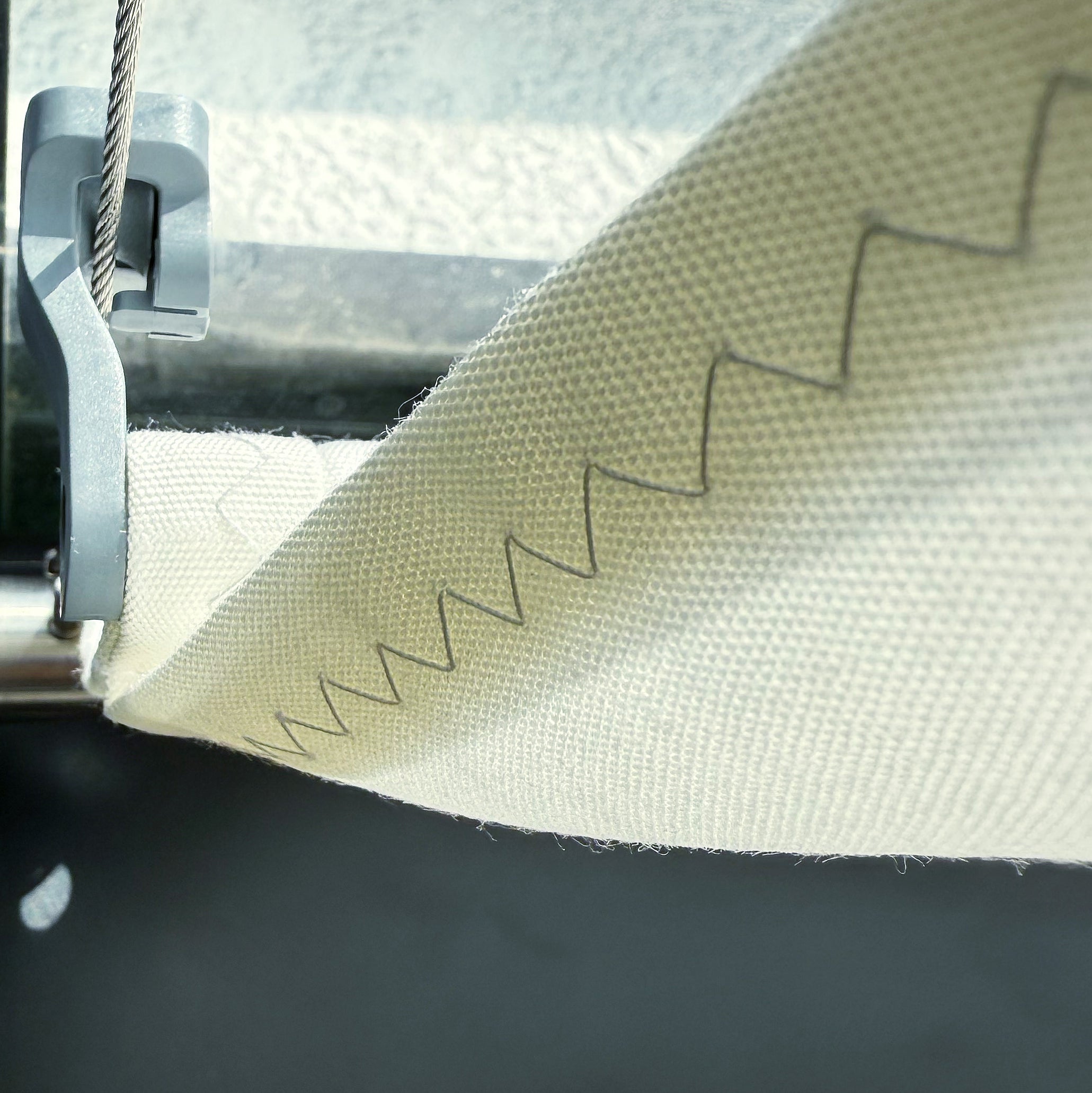 Bei der SPANNMAXXL-Seilspannmarkise wird das Textil – die Wolkenbahn – von einem angefertigten Seil getragen. (Passgenaue Spannseile aus Edelstahl mit Rechts- Linksgewinde – | SPANNMAXXL-Vorteil#24 – passgenaue Spannseile) Oft wird das Textil, also die eigentliche Markise, mit Ösen, Laufhaken , Gleiter, oder Clips am Seil befestigt – bei SPANNMAXXL kommen Pendelhaken und Roll-Pendelhaken zum Einsatz, die das Gewicht der Wolkenbahn senkrecht unter dem Seil pendeln lassen.