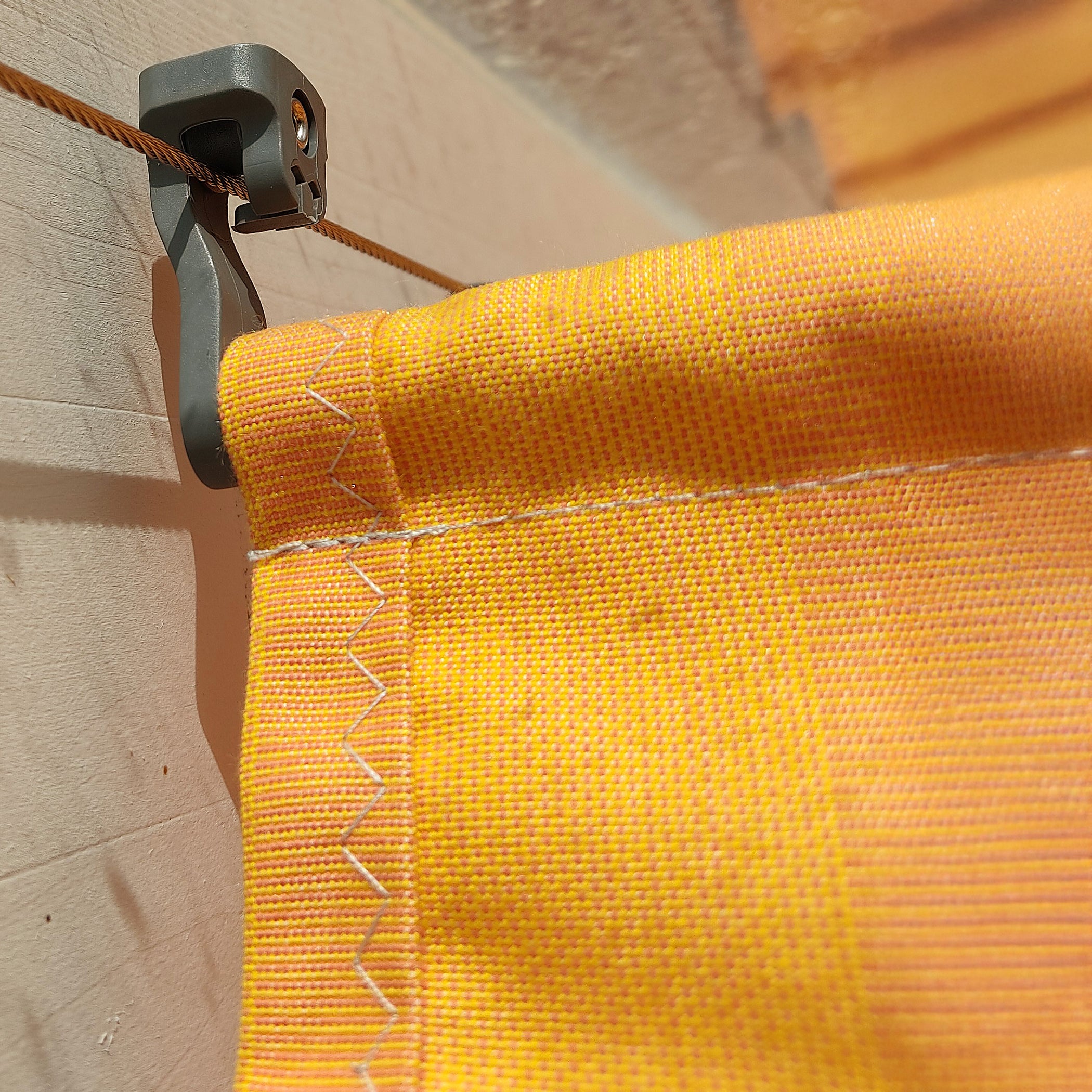 Am oberen Ende, wo die Ecke mit Edelstahl-Öse die Verbindung zum Zylinder im Edelstahl-Spannseilsystem herstellt, umsäumt die Zick-Zack-Naht den Wandanschluss. Meist den Anschluss am Haus oder – in aller Regel – den höchsten Punkt der Wolkenbahn.